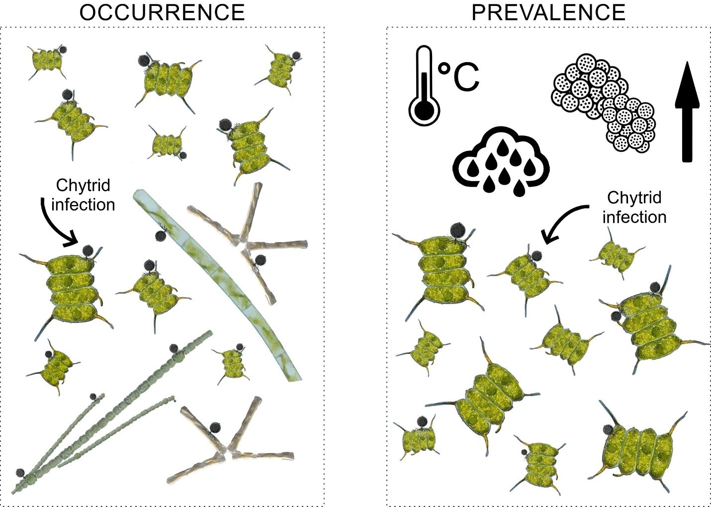 Naukowcy z naszego Instytutu wykazali, że zmiany środowiskowe napędzane zmianami klimatu mogą znacząco wpływać na pasożytnicze interakcje pomiędzy grzybami chytrydowymi a fitoplanktonem słodkowodnym. Analiza wieloletniego zbioru danych środowiskowych i zespołów fitoplanktonu wykazała, że występowanie i prewalencja infekcji jest zmienna w czasie i między zbiornikami. Wyższe temperatury, większe opady i występowanie zakwitów sinic jednocześnie wpływały na wyższą prewalencję pasożytów na mikroglonach. Te wyniki sugerują, że postępujące zmiany klimatu mogą intensyfikować presję pasożytniczą w słodkowodnych ekosystemach, z możliwymi konsekwencjami dla funkcjonowania całej sieci troficznej i kondycji ekosystemu.