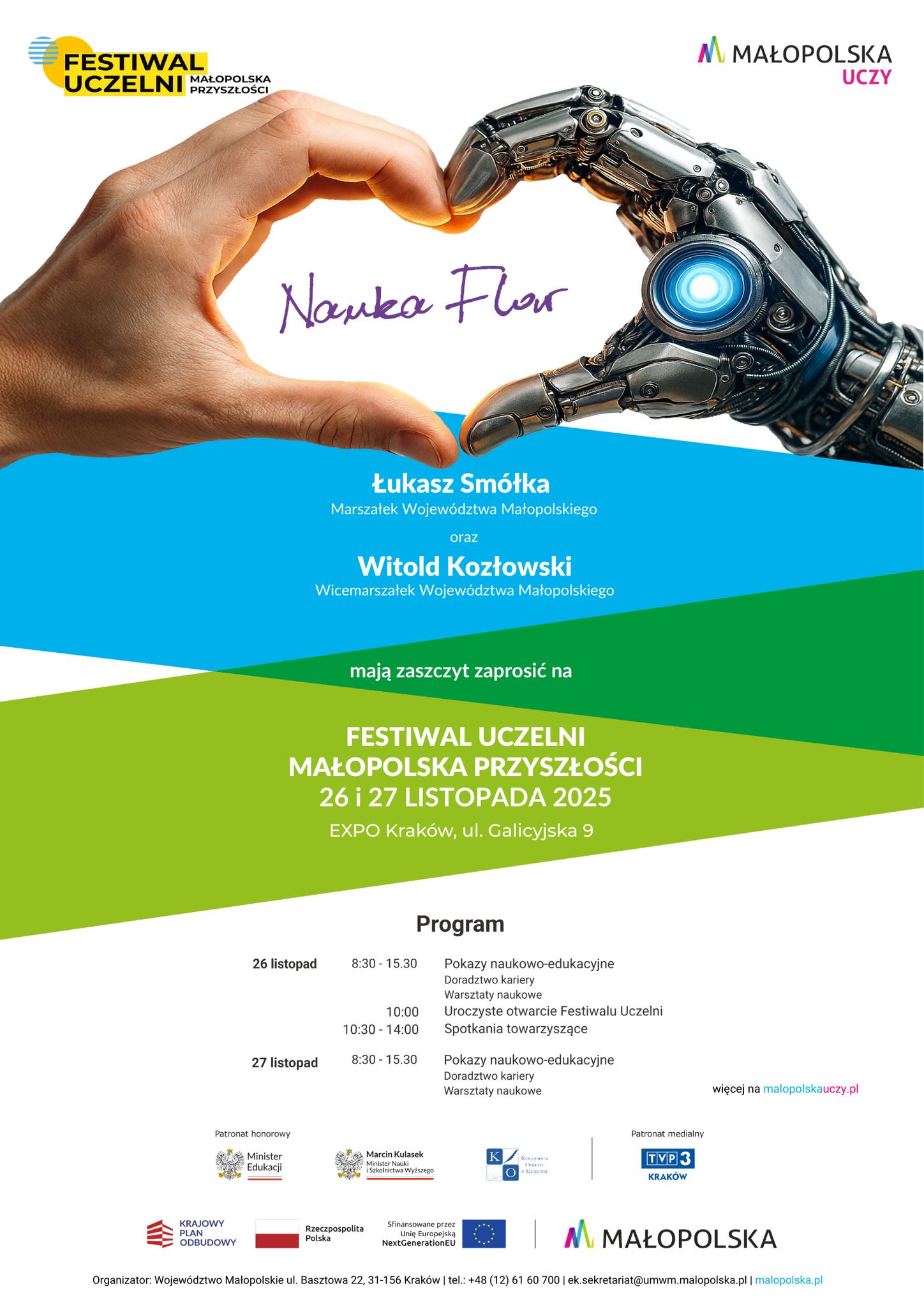 Serdecznie zapraszamy do udziału w "Festiwalu Uczelni – Małopolska Przyszłości 2025", który odbędzie się 26–27 listopada 2025 roku w EXPO Kraków przy ul. Galicyjskiej 9.