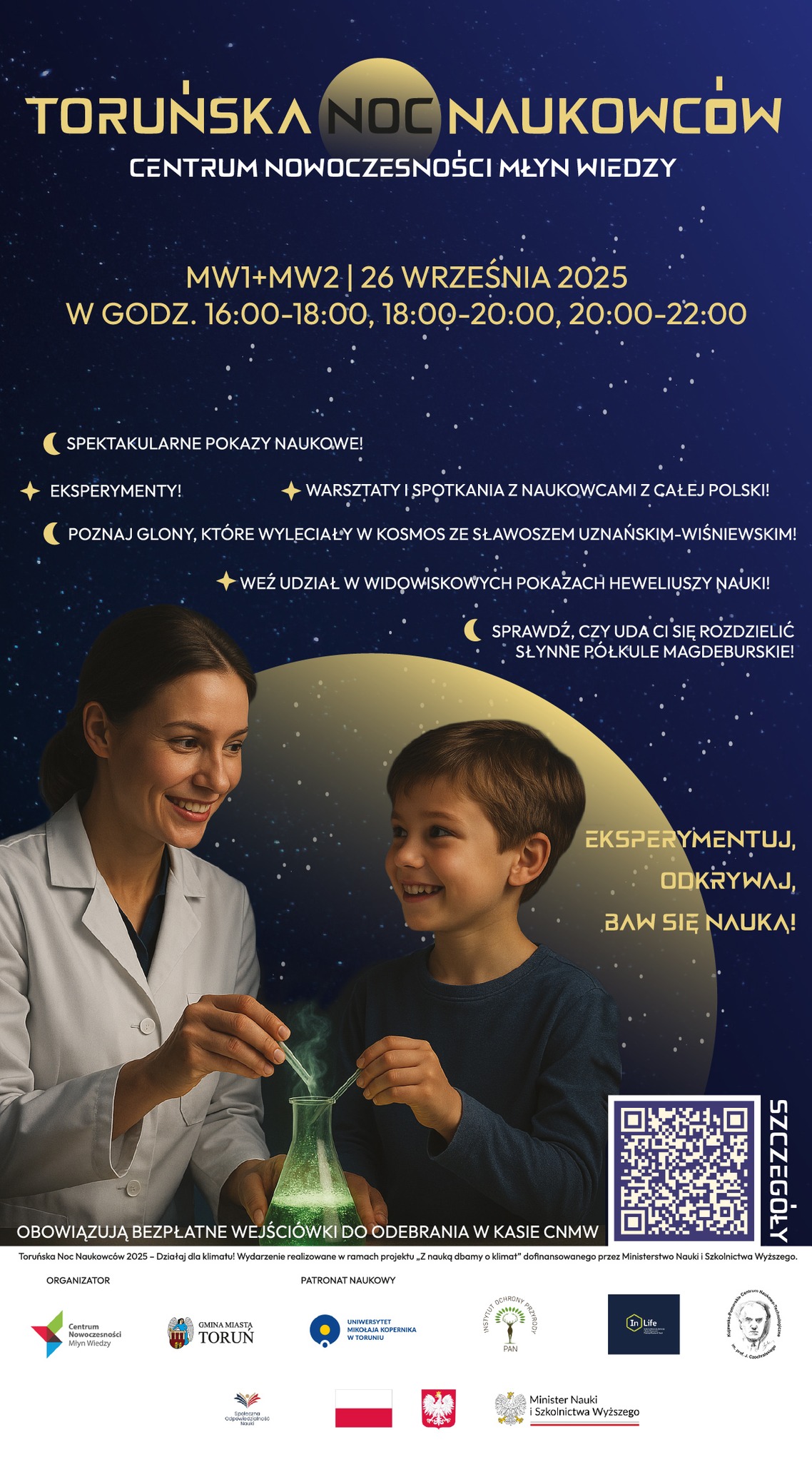 W piątek 26.09.2025 r. odbyła się „Toruńska Noc Naukowców 2025 – Działaj dla klimatu – Polska w obliczu kryzysu klimatycznego”. Centrum Nowoczesności Młyn Wiedzy zorganizowało z tej okazji liczne pokazy, warsztaty i spotkania z naukowcami w ramach projektu pn. „Z nauką dbamy o klimat”. Poruszone zostały najbardziej aktualne i nurtujące tematy dotyczące ochrony środowiska i przyrody dotyczące m.in. zanieczyszczenia i ochrony wód, gleb i powietrza. Instytut Ochrony Przyrody PAN objął wydarzenie patronatem naukowym.
